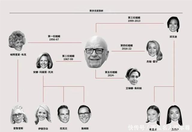 注:默多克去世后,局势将变成四个年长子女一人一票 可以预见:到时候谁也不服谁,分蛋糕就得靠吵架。这也是后来继承大战的「伏笔」,鲁伯特·默多克早早就埋下了「家庭辩论赛」的种子。 除了这份埋雷的家族信托,鲁伯特·默多克复杂的婚育关系也是另外一个雷。 他共经历过五段婚姻,与其𰷅任妻子共育名子女。名子女构成的家族图谱,也从一开始就埋下了纷争的种子。